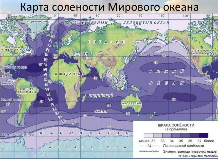 Соленость океанической воды от экватора к полюсам уменьшается.Это связано с большим испарением в районе экватора, малым количеством рек, высокой температурой.