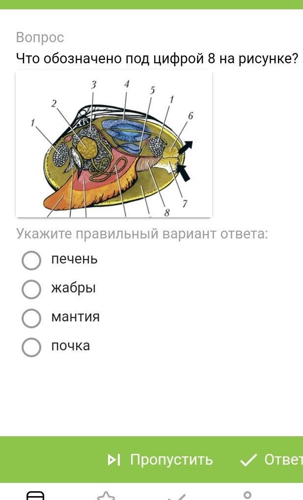 На рисунке под цифрой 8 обозначен орган дыхания моллюска - жабры.