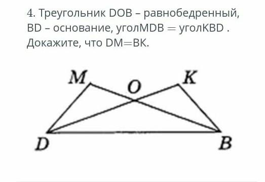 ∆DOB – равнобедренный с основанием BD по условию, следовательно угол ODB=угол OBD, так как углы при основании равнобедренного треугольника равны.