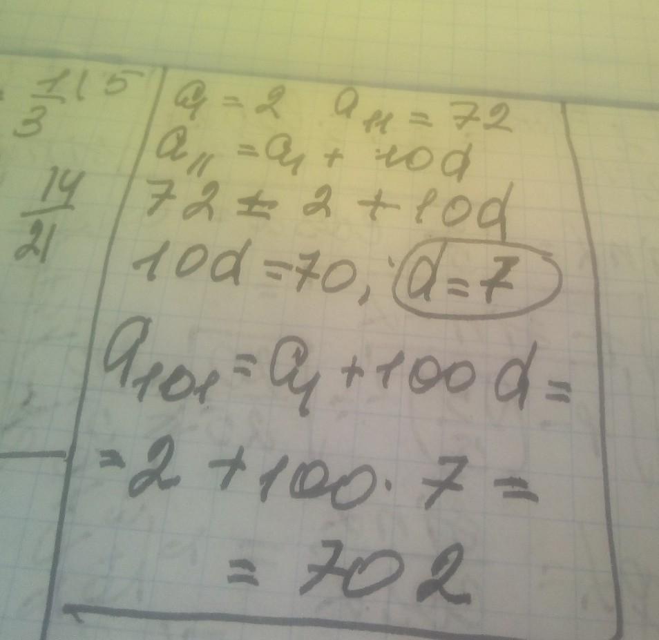 Для арифметической прогрессии, в которой а1 = 2, а11 = 72, найдите разность и а101.