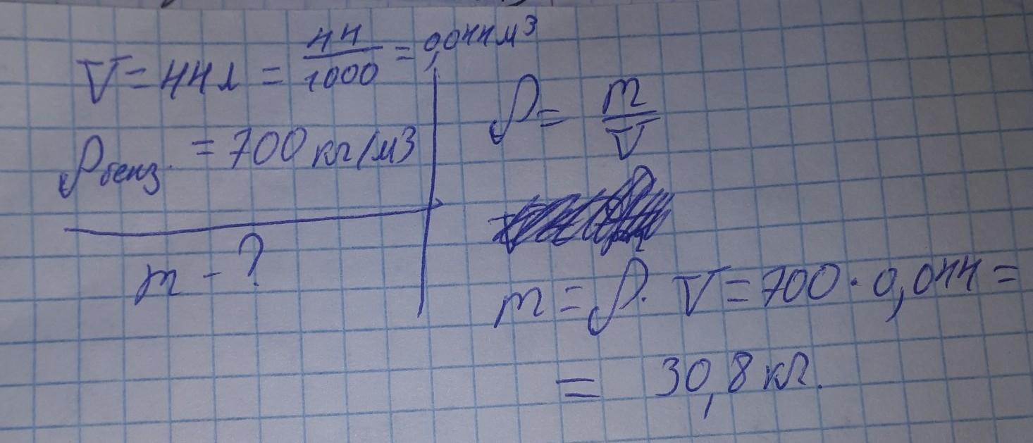 Объём бензобака автомашины равен 44 л, ρбенз.=700кг/м3.