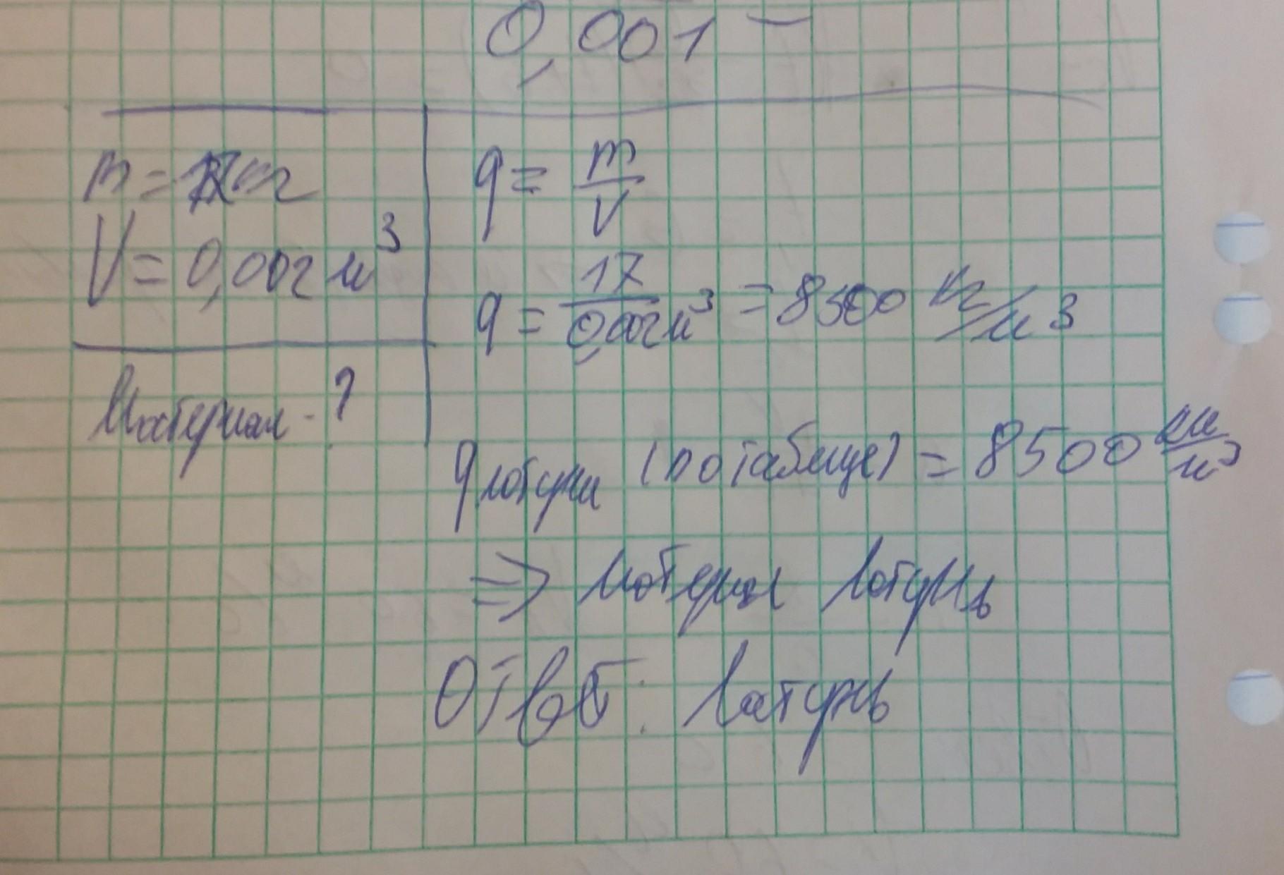 найдем плотность, а по ней определим вещество плотность 8500 и по таблице определяем материал.