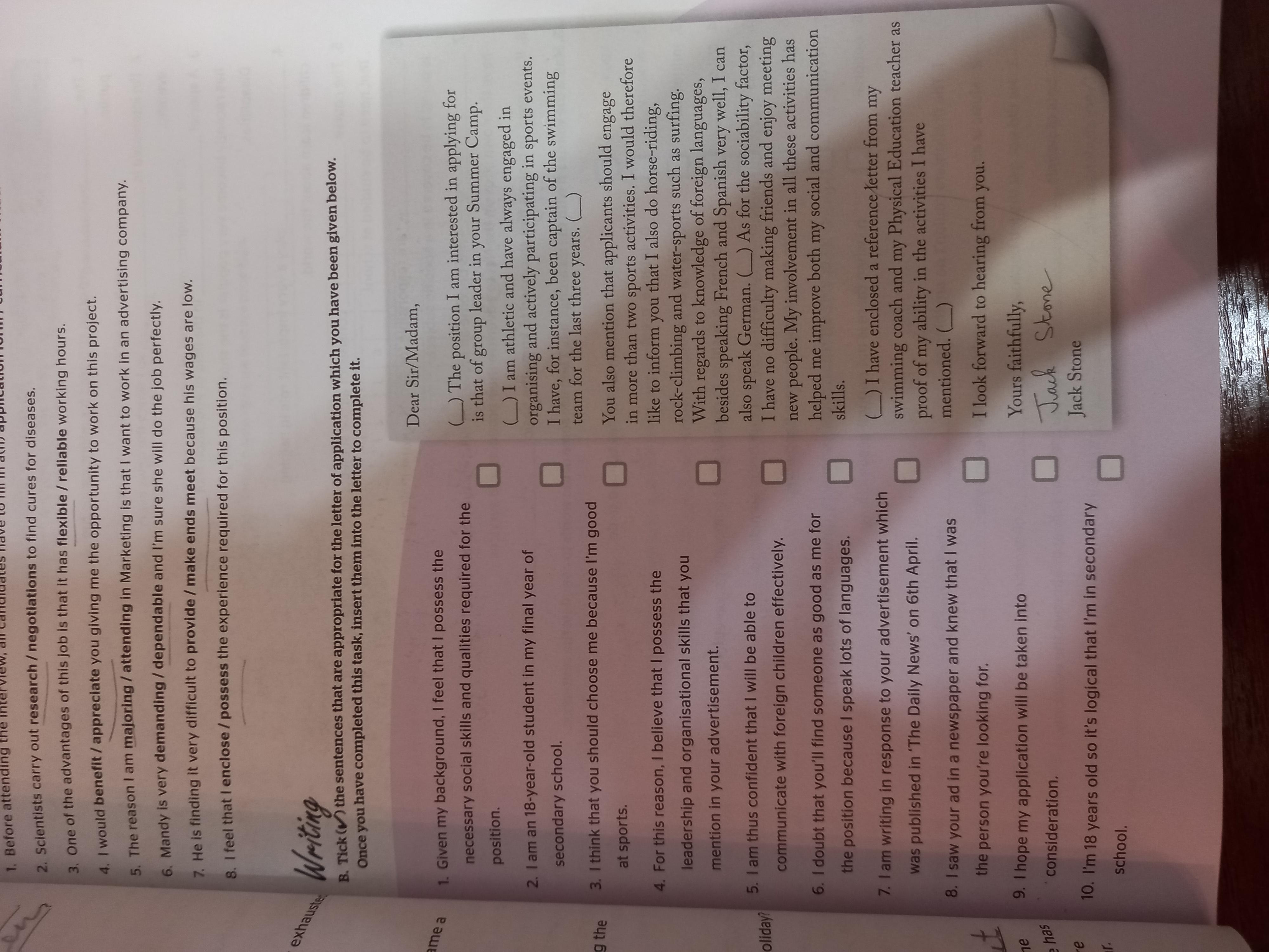 I think that you should choose me because I'm good at sports. I am athletic and have always engaged in organising and actively participating in sports events. I have, for instance, been captain of the swimming team for the last three years. For this reason, I believe that I possess the leadership and organisational skills that you mention in your advertisement.