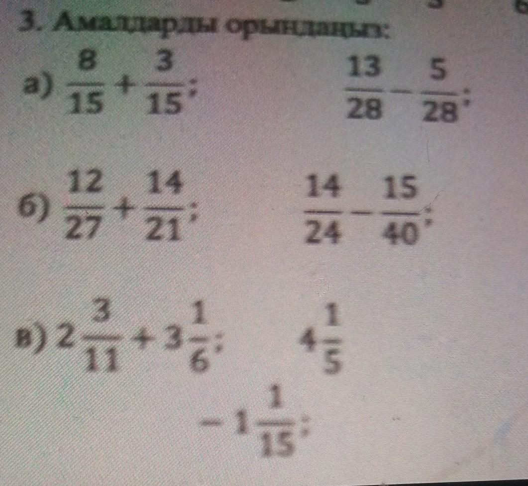 а) 8/15 + 3/15 = 11/15 ; 13/28 - 5/28 = 8/28