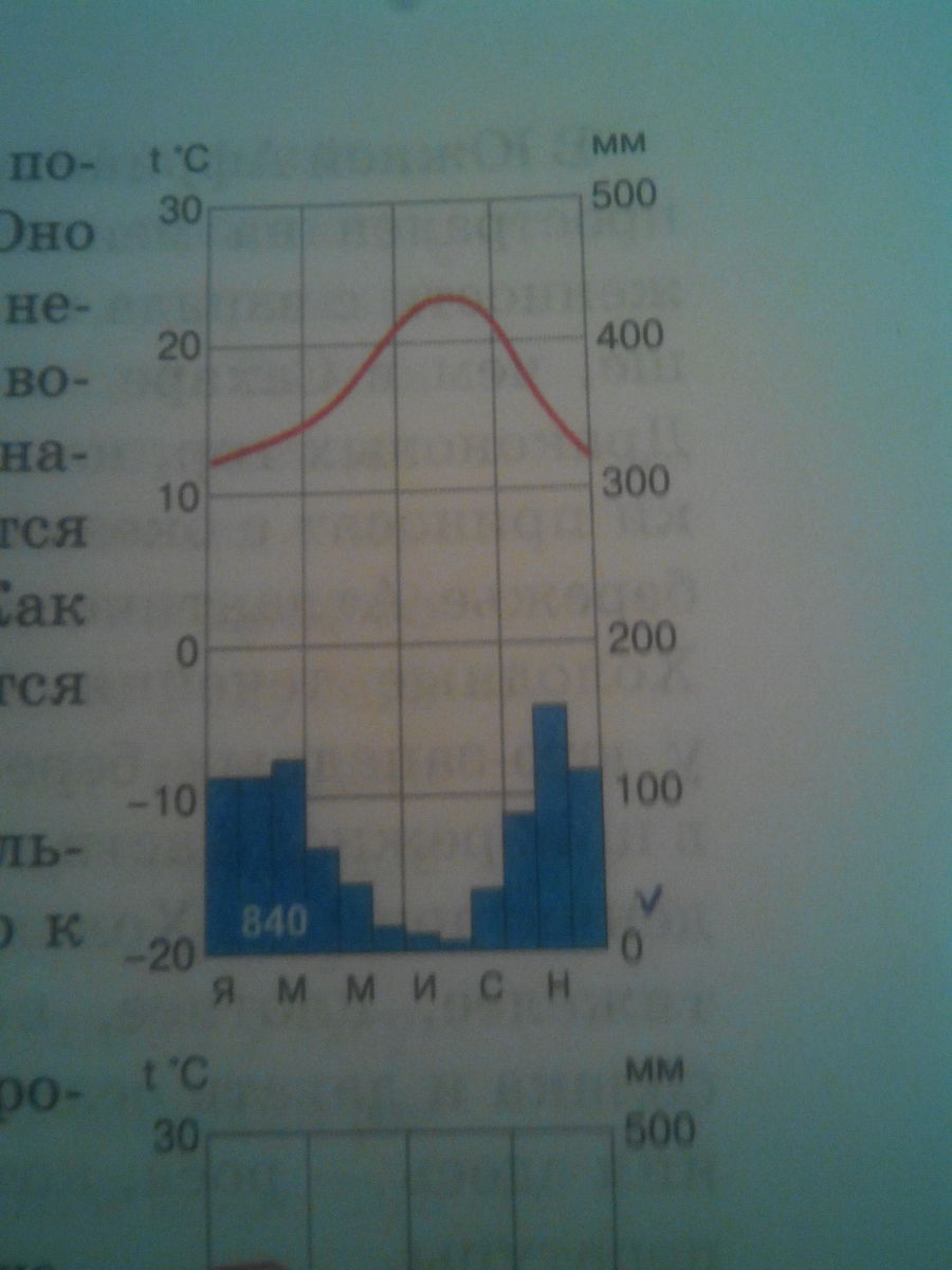 3) В данном пункте выпадает в среднем 840 мм осадков в год. Большей частью - в холодное полугодие, летом осадков почти нет.