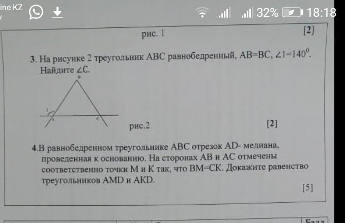 угол а=180-140=40 градусов так как эти два угла смежные, а их сумма 180 градусов. так как ав=вс, то треугольник равнобедренный, а угол а= углу с. угол с =40 градусов