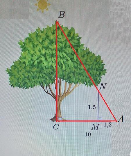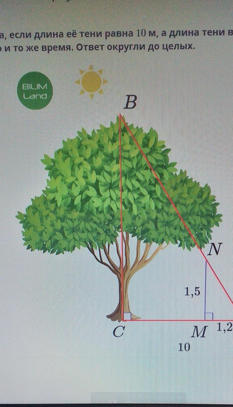 Вычисли высоту дерева, если длина её тени равна 10 м, а длина тени вертикального столба высотой