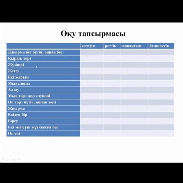 Бөлшектік: Жиырма бес бүтін, оннан бес, Екі жарым, Он төрт бүтін оннан жеті, Екіден бір,