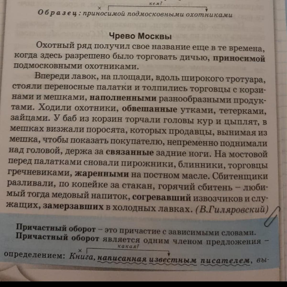 прочитайте выразительно текст. Выпишите выделенные причастия с зависимыми словами. Обозначьте по образцу Образец: приносимой подмосковными охотниками