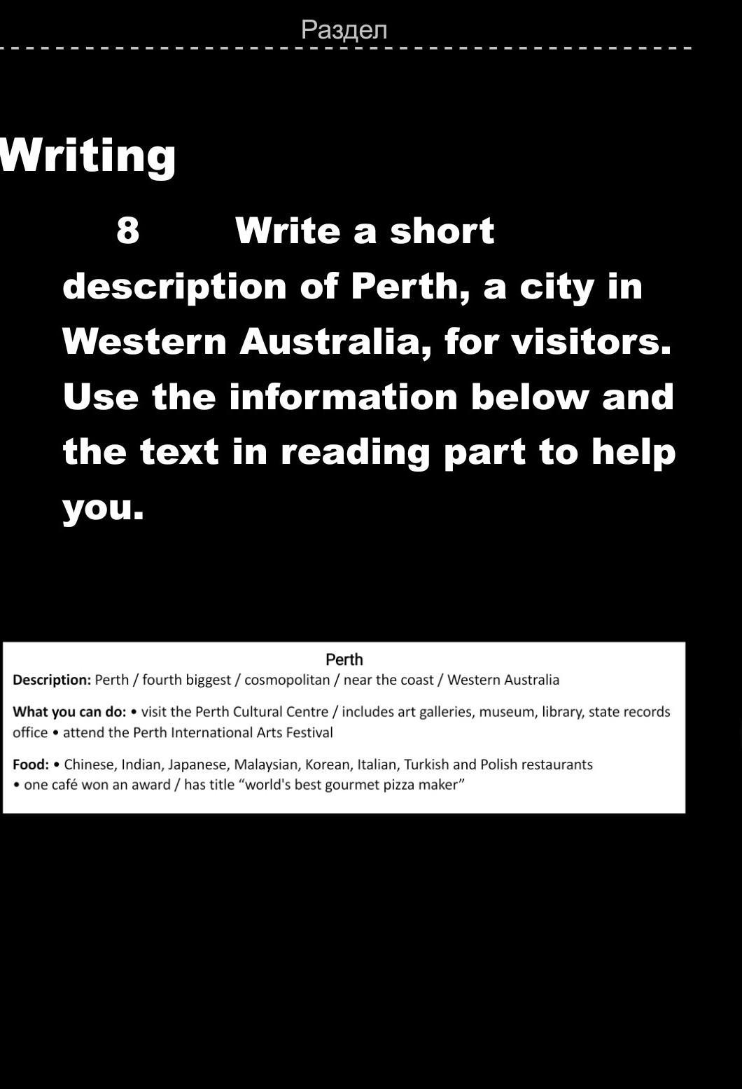 8 Write a short description of Perth, a city in Western Australia, for visitors. Use the information below and the text in reading part to help you.