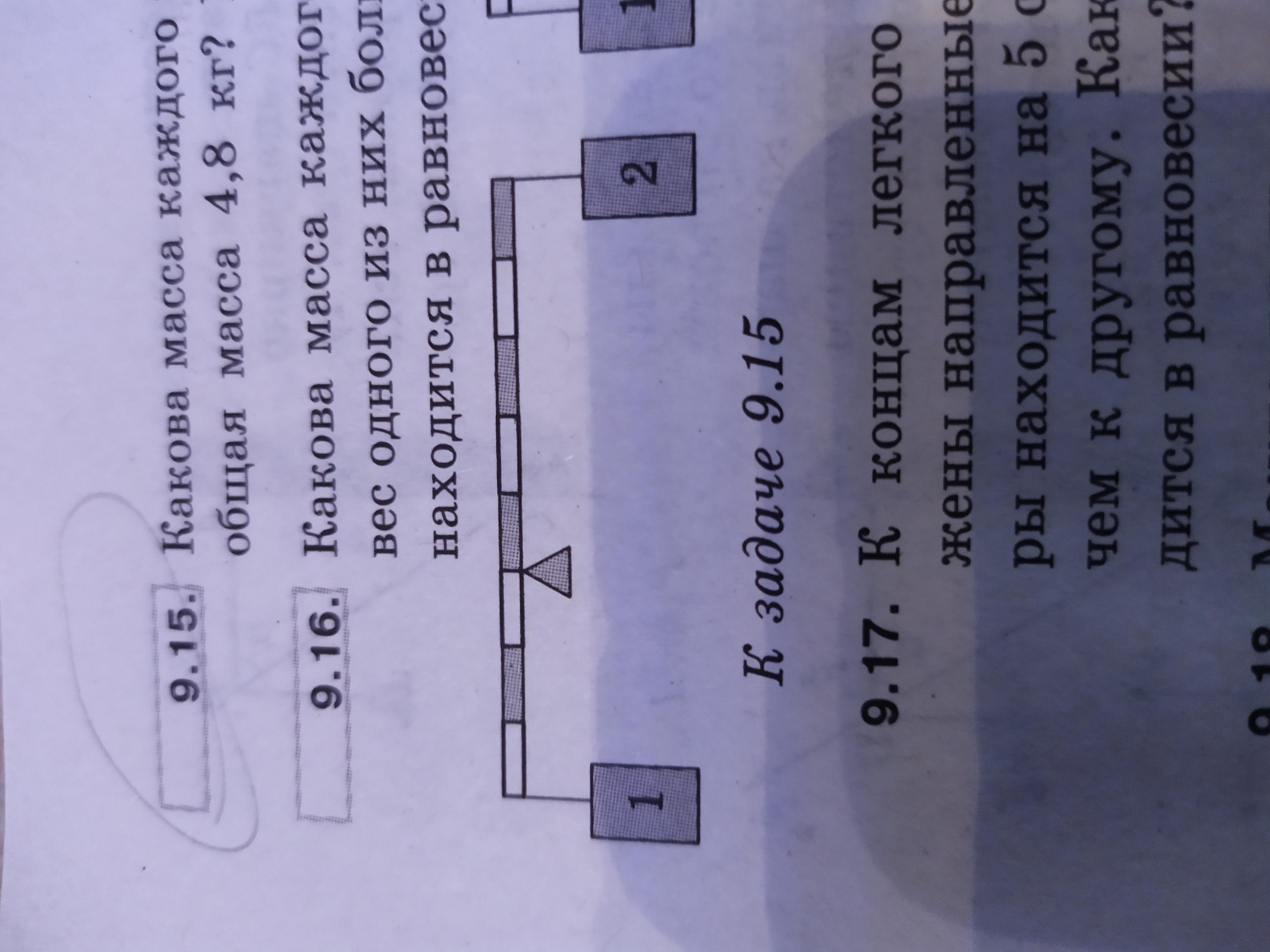 Какова масса каждого из грузов (см. рисунок), если их общая масса 4,8 кг? Рычаг находится в равновесии.