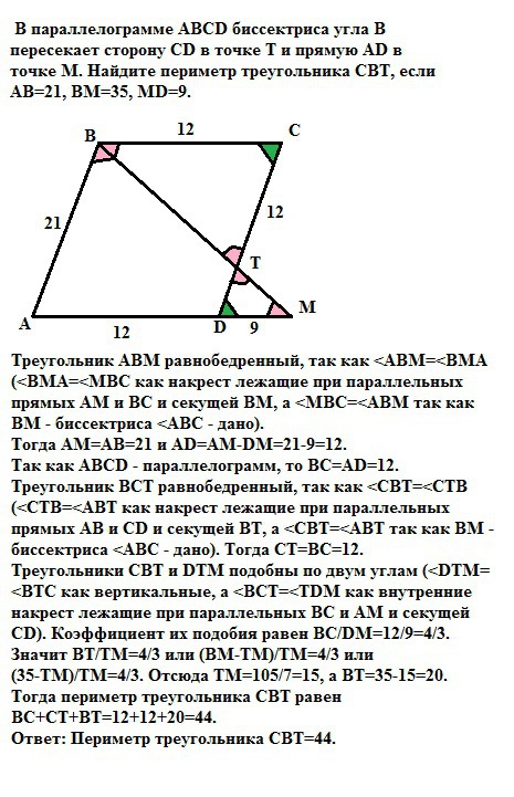 В параллелограмме ABCD биссектриса угла B пересекает сторону CD в точке T и прямую AD в точке M. Найдите периметр треугольника CBT, если АВ=21, BM=35, MD=9.