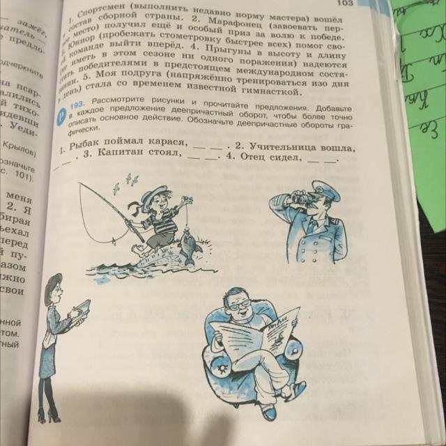 Рыбак поймал карася, сидя на берегу. Учительница вошла , радуясь встрече с учениками. Капитан стоял на мостике, внимательно вглядываясь в даль. Отец сидел, читая газету