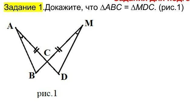 ∆АВС=∆МДС по стороне и двум прилежащим к ней углам. AC=CM угол ВАС=СМD