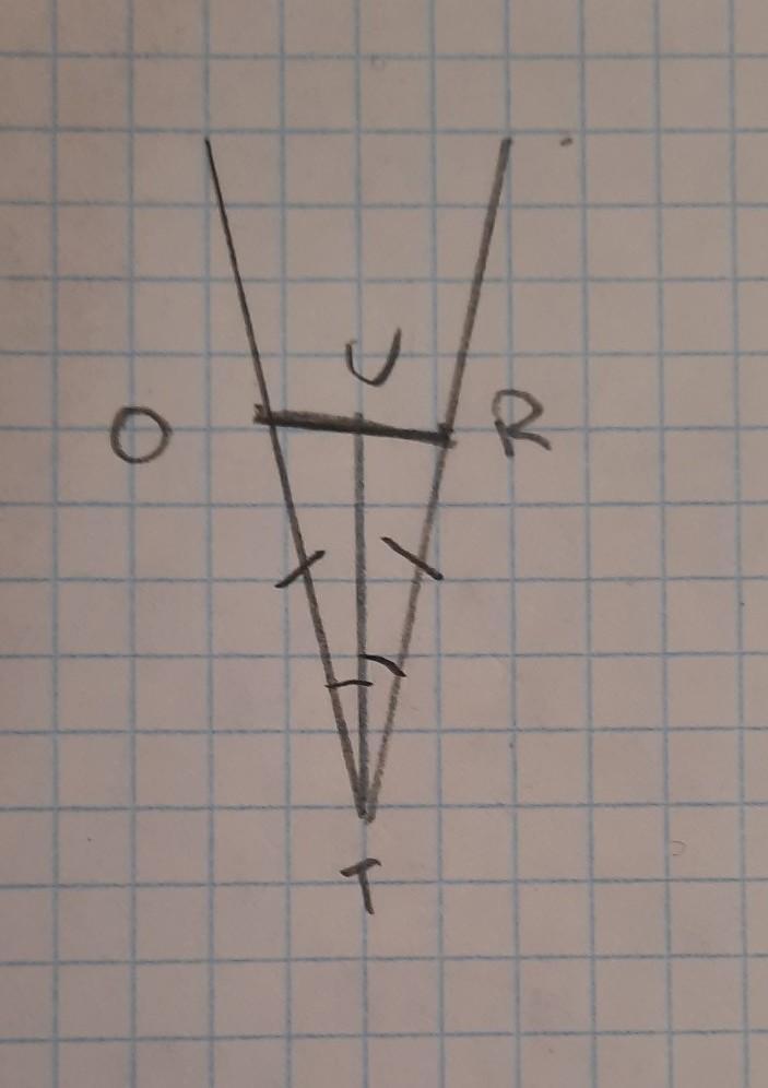 2.Луч TU – биссектриса угла. На сторонах угла отложены равные отрезки TO и TR. Запишите равные элементы треугольников TOU и TRU и определите, по какому признаку треугольники равны.