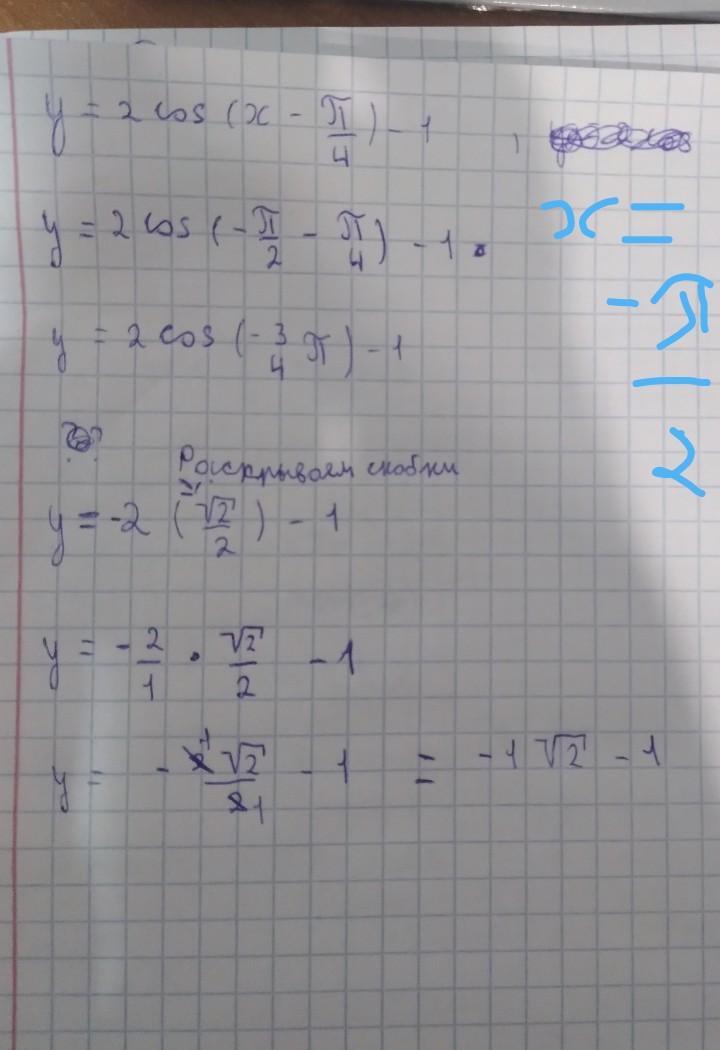 х= -п/2 ; то у=2cos (-п/2-п/4)-1=2cos (-3п/4)-1=-2·(√2/2)-1=-√2-1