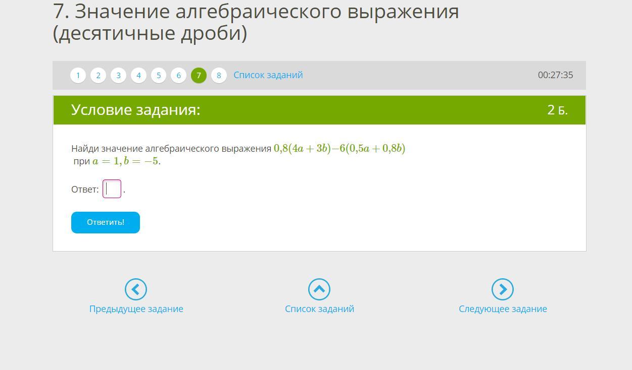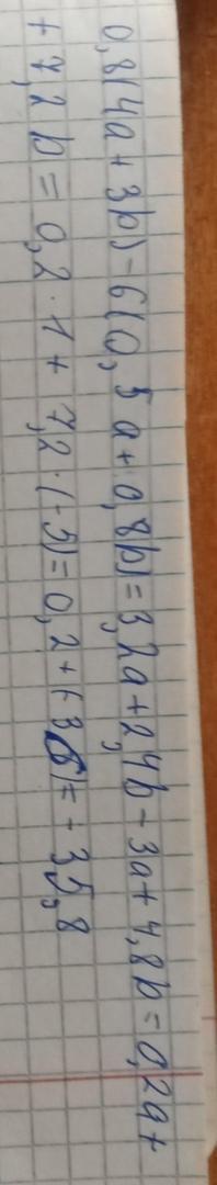 Найди значение алгебраического выражения 0,8(4a+3b)−6(0,5a+0,8b)