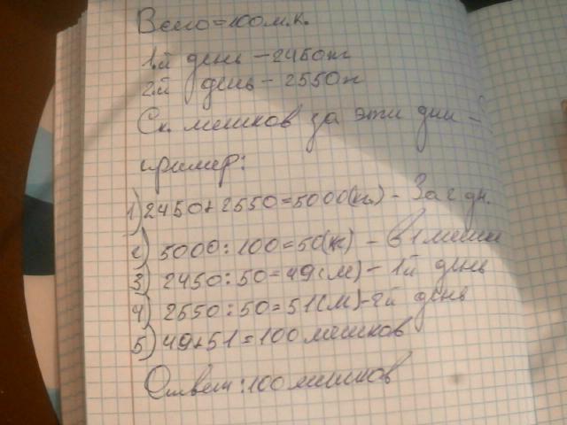в фермерском хозяйстве работники собрали 100 мешков картофеля в первый день они собрали 2450 кг картофеля а во второй 2550 кг картофеля Сколько мешков картофеля работники собрали За эти дни ЗАКРЕПИТЕ ФОТО даю 20 балов