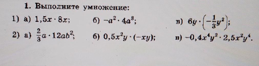 1) а)12x2 б)-4a10 в)-2y3 2) а)8ab2 б)-0,5x3y2 в)-1x6y7