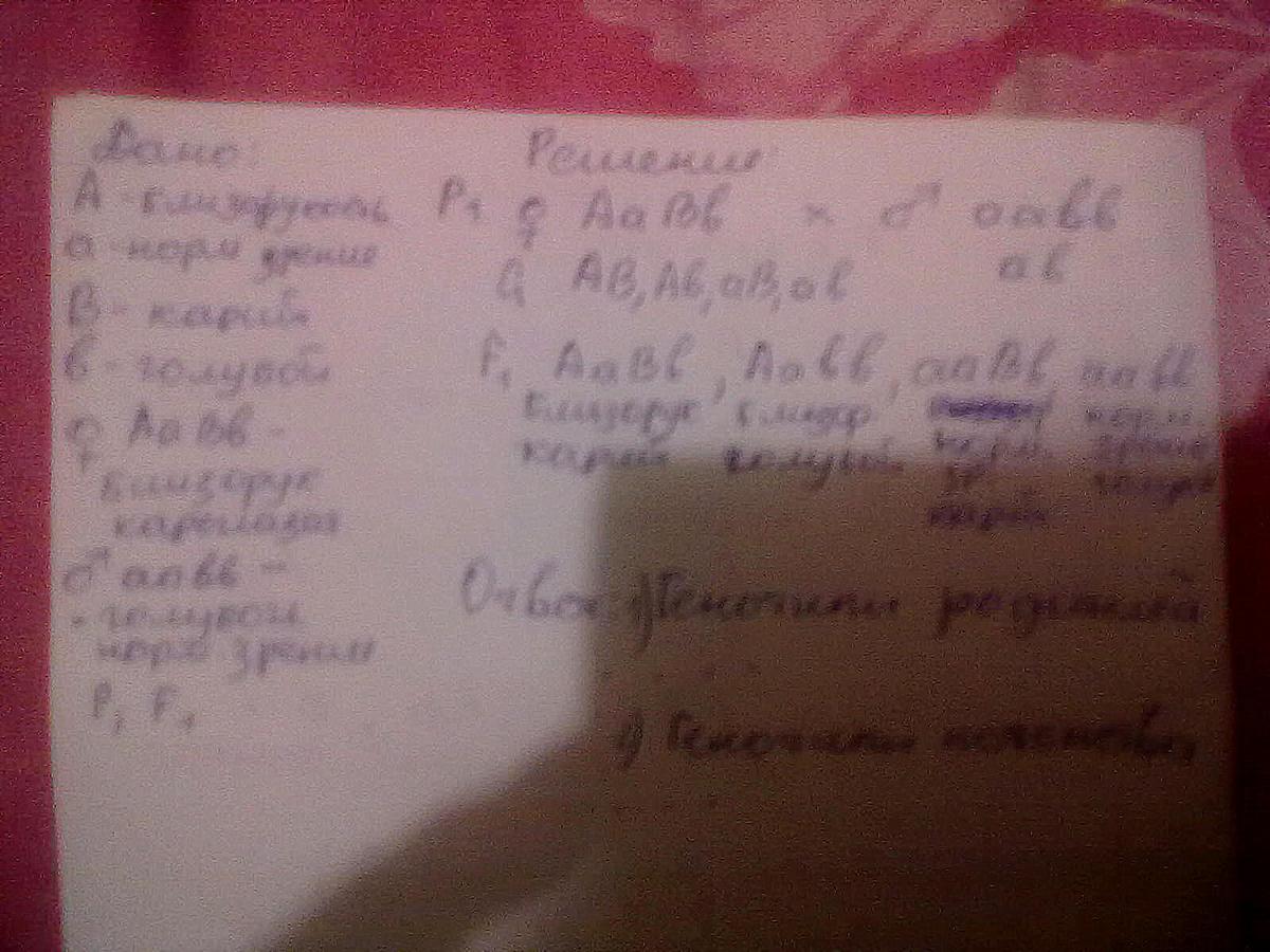 У человека близорукость доминирует над нормальным зрением, а карий цвет глаз - над голубым. Какое потомство можно ожидать от брака женщины кареглазой и близорукой с мужчиной голубоглазым и с нормальным зрением. ( ЖЕНЩИНА ГЕТЕРОЗИГОТА, МУЖЧИНА ГОМОЗИГОТА- РЕЦЕСИВНЫЙ)