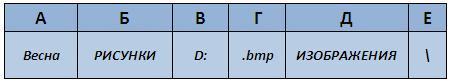 Файл Весна.bmp хранится на жёстком диске в каталоге РИСУНКИ, который является подкаталогом каталога ИЗОБРАЖЕНИЯ. В таблице приведены фрагменты полного имени файла. Восстановите полное имя файла и закодируйте его буквами (запишите последовательность букв без пробелов и запятых). Выбрать получившуюся последовательность букв: ВЕДЕБЕГА ВЕДЕБЕАГ ДЕБЕАГ ВЕДЕБЕАГЕ