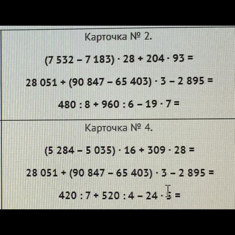 решите математику пожалуйста в по действиям а действия в столбик(только карточку 4)