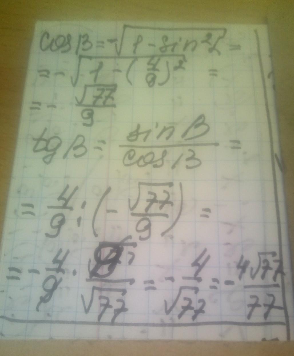 найдите косинус В и тангенс В, если синус В = 4/9 и 90градусов<В<180градусов