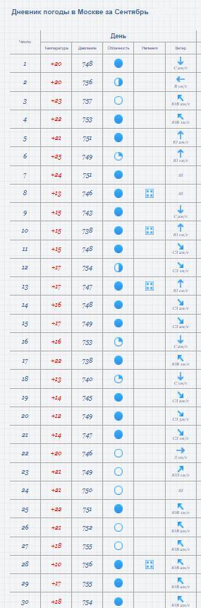 Календарь погоды дан ниже в приложении по г. Москва.По нему видно, что погода в Москве в сентябре месяце стояла ещё тёплая, температура воздуха днём не опускалась ниже +10°.Дождей было немного (4 дня).Преобладала пасмурная погода.