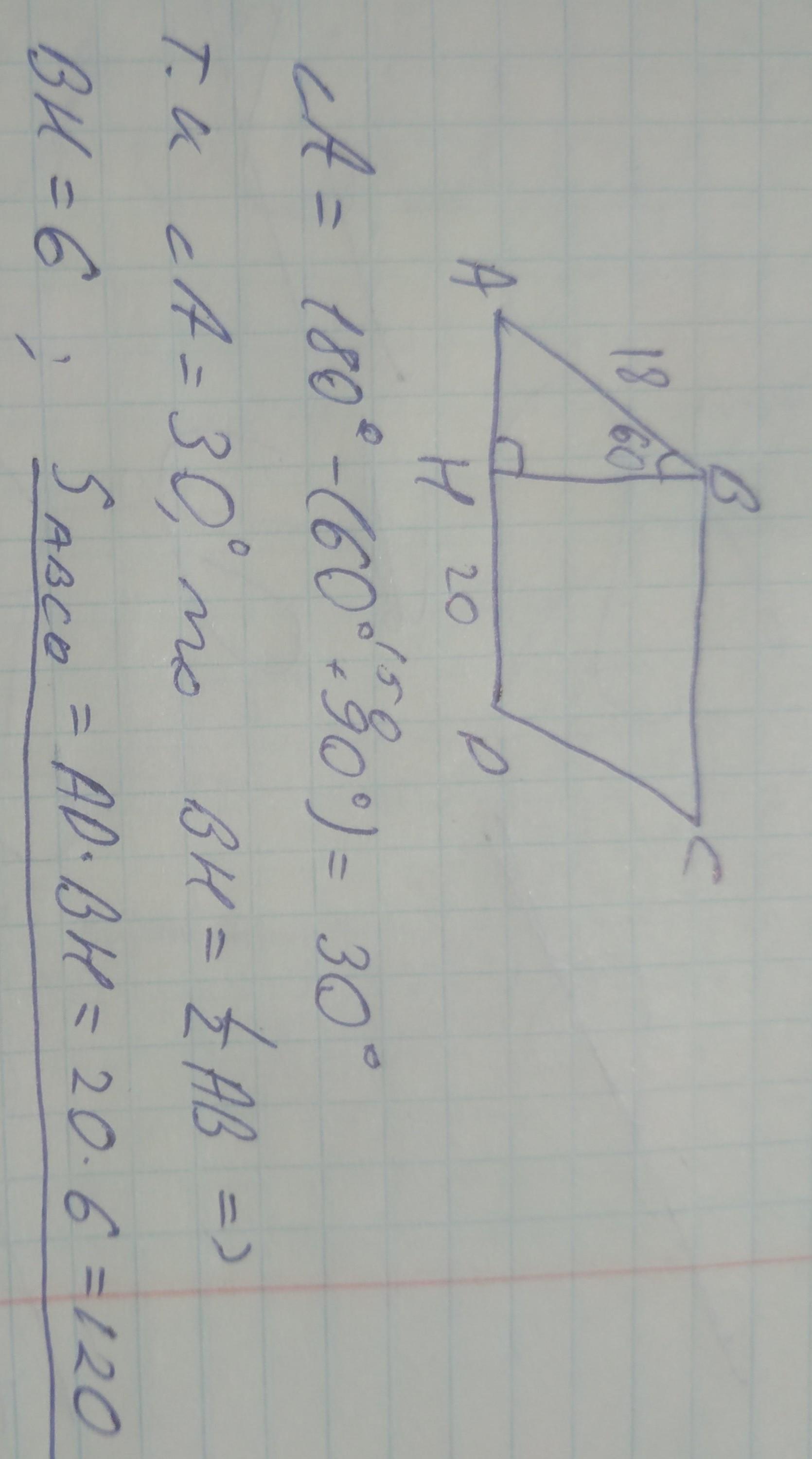 В параллелограмме ABCD сторона AB=18, а угол ABH=60°. Найдите площадь параллелограмма ABCD, если сторона AD=20см.