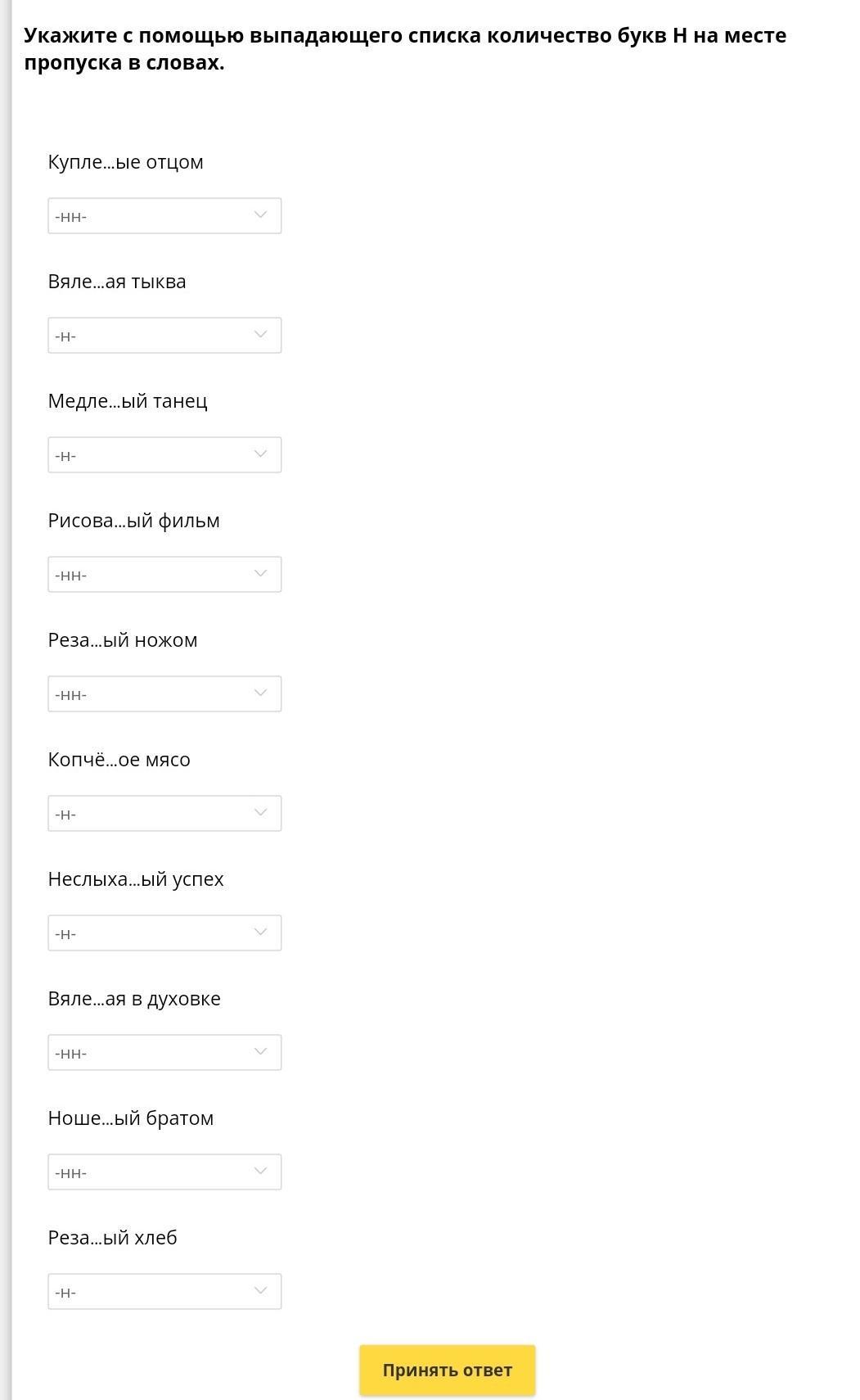 Купленные отцом, валеная тыква, медленный танец, рисованный фильм, резанный ножом, копченое мясо, неслыханный успех, вяленая в духовке, ношенный братом, резаный хлеб.