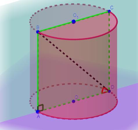 Решение: По определению осевое сечение цилиндра плоскостью является прямоугольником, следовательно ABCD - прямоугольник. Так как ABCD - прямоугольник, то по свойствам прямоугольника угол ∠BAD = 90°. Так как точка A принадлежит нижнему основанию цилиндра, а точка B принадлежит верхнему основанию цилиндра при этом угол ∠BAD = 90°, то AB - образующая цилиндра. По свойствам цилиндра его образующая является высотой. Рассмотрим прямоугольный треугольник ΔBAD: