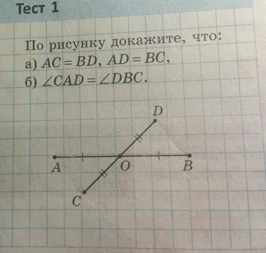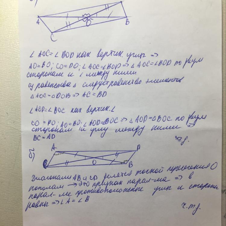 АО=ОВ (по усл.), СО=ОД (по усл.), ∠АОС=∠ДОВ (как вертикальные) ⇒ треугольники АСО и ДВО равны по 1 признаку ⇒ АС=ВД (как стороны равных треугольников); Треугольники АОД и СОВ также равны аналогично по 1 признаку ⇒ АД=ВС (как стороны равных треугольников)