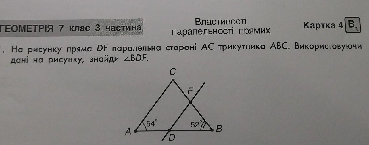 на рисунку прямя DF параллельна стороні AC трикутника ABC . Використовуючи дані на рисунку , знайди Кут BDF