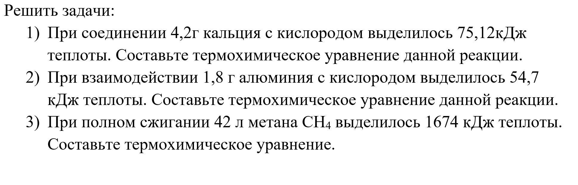 Задача №1. При соединении 4,2 г кальция с кислородом выделилось 75,12 кДж теплоты. Составьте термохимическое уравнение данной реакции.