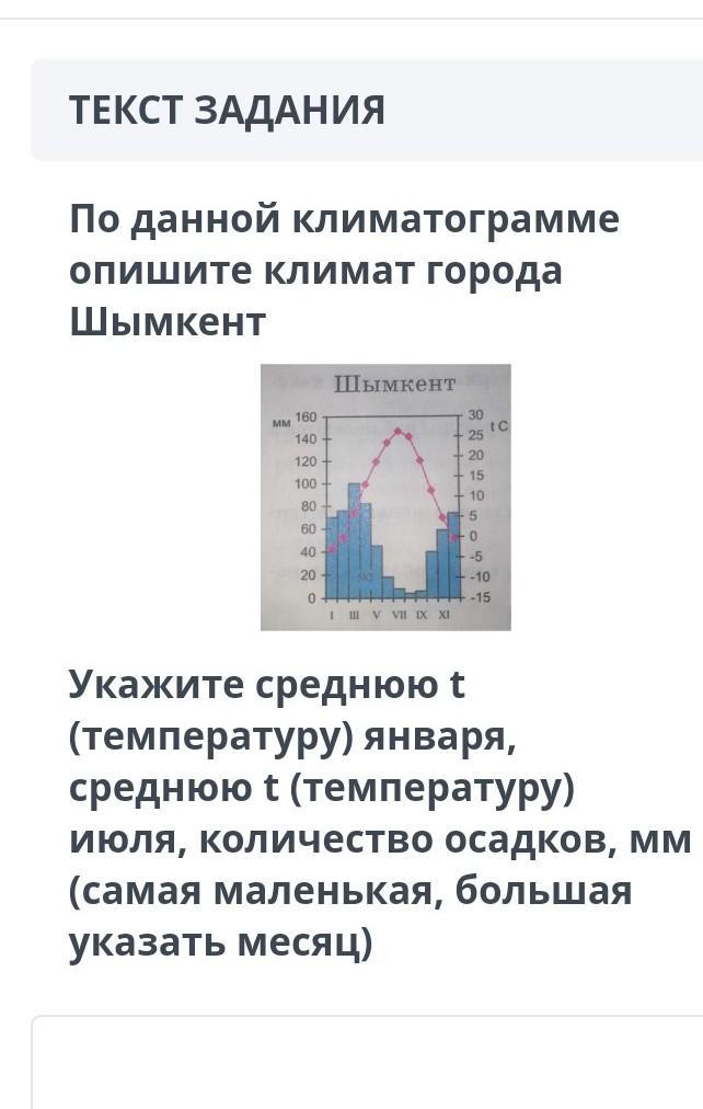 средняя января -5, а июля 27 градусов. месяц в котором больше всего осадков март=100мм, а самая маленькая количество осадков в августе=5мм