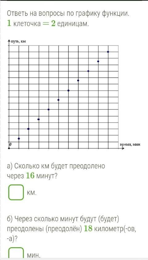 по графику видно, что за одну минуту проходит 1.5 км, и с этого берем что за 16 минут он проедет 24 км(16*1.5), также во втором 18 км проедет за 12 минут(18 км:1.5)