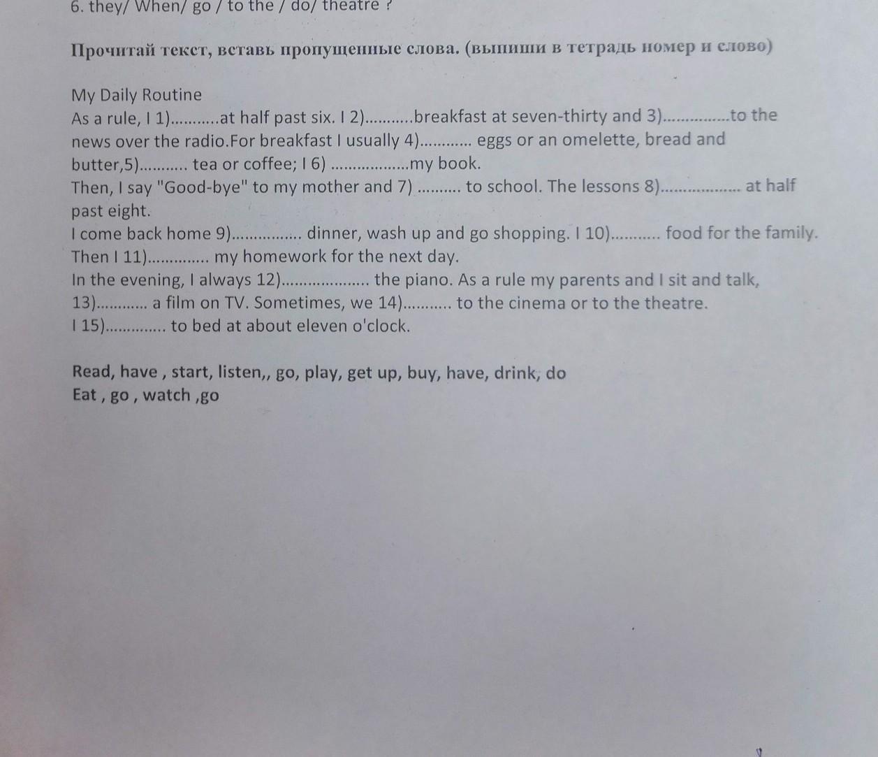 1) get up, 2) have, 3) listen, 4) eat, 5) drink, 6) read, 7) go, 8) start, 9) have, 10) buy, 11) do, 12) play, 13) watch, 14) go, 15) go.