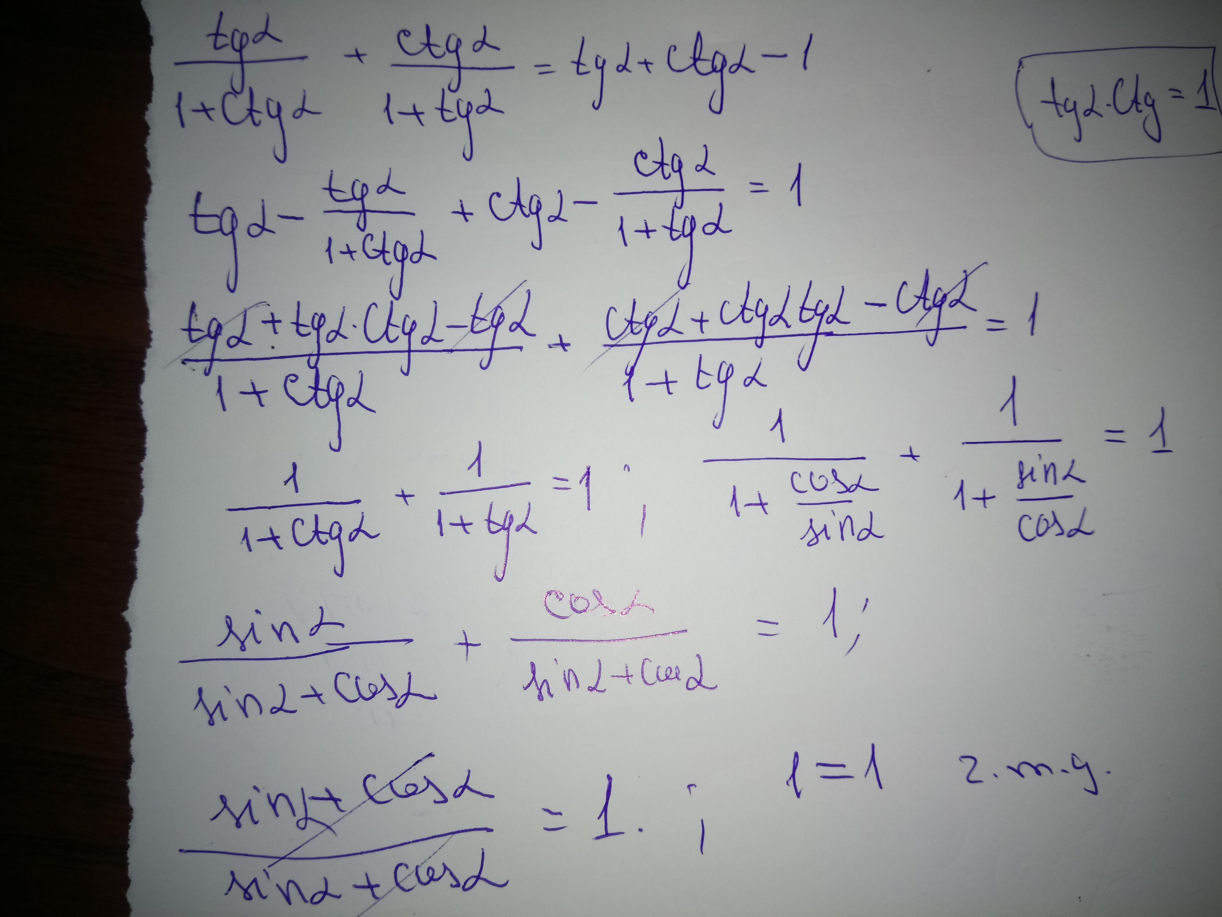 Докажите тождество tg(a)/1+ctg(a)+ ctg(a)/1+tg(a)=tg(a)+ctg(a)-1