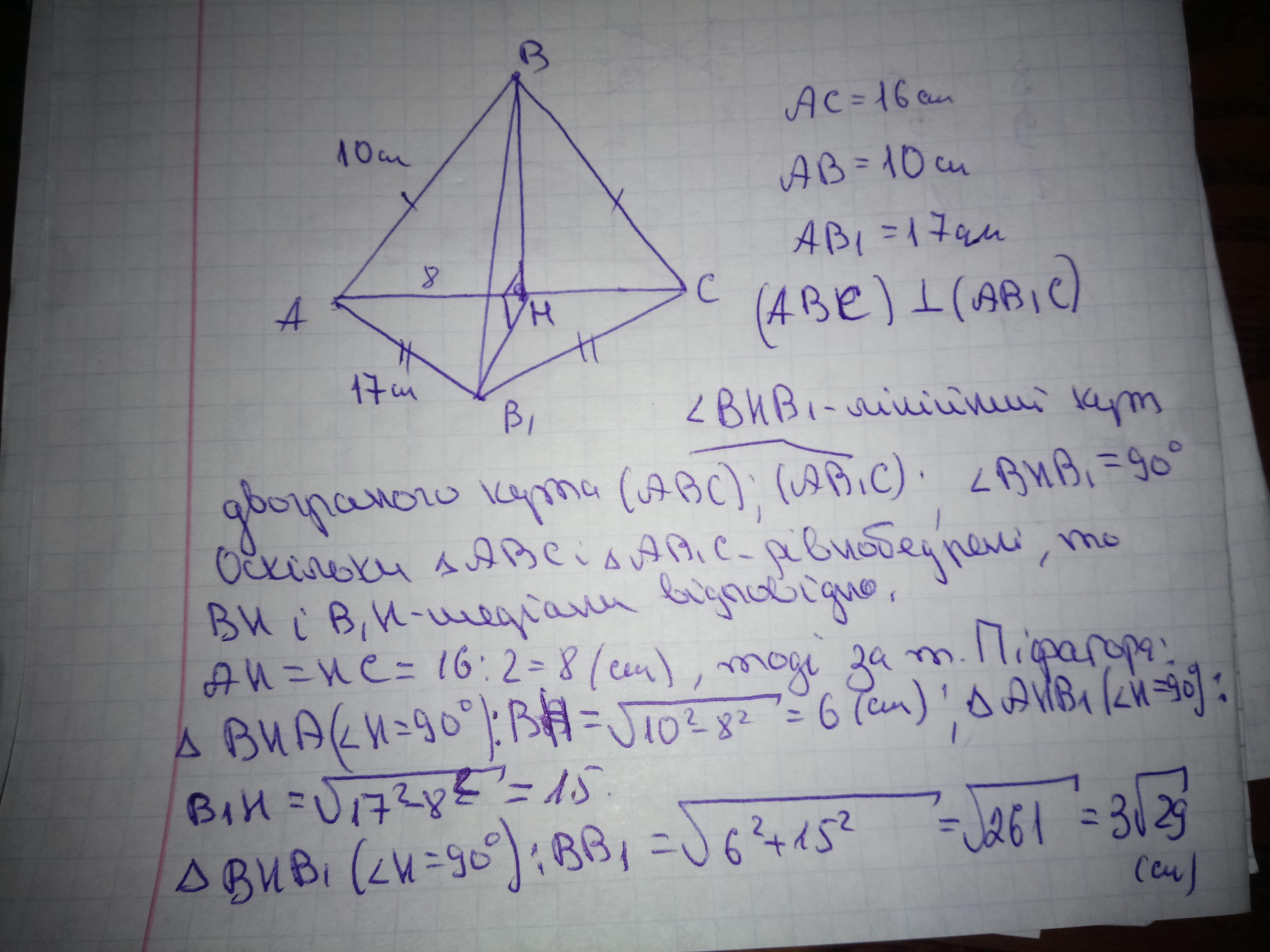 Два рівнобедрених трикутники ABC і AB1С мають спільну основу AC = 16 см. Площини цих трикутників взаємно перпендикулярні. Знайдіть відстань між точками B і B1, якщо AB = 10 см, AB1 = 17 см