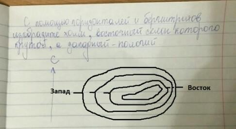 Изобразить схематически горизонталями (не менее з-х горизонталей) холм с крутым южным склоном, вытянутый по направлению запад-восток.