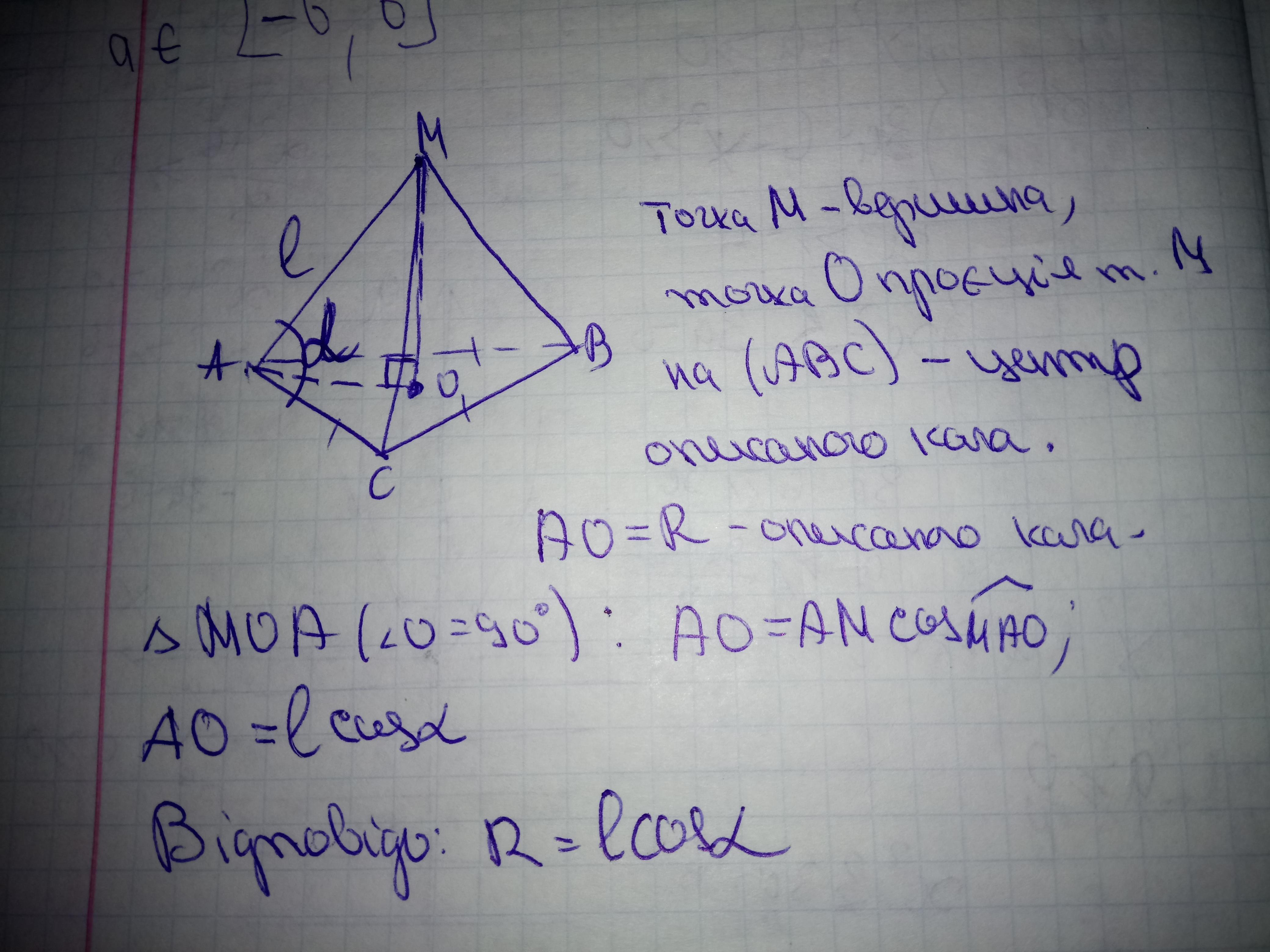 у правильній трикутної піраміди бічне ребро дорівнює l і утворює з основою кут альфа знайдіть радіус кола описаного на в коло основ