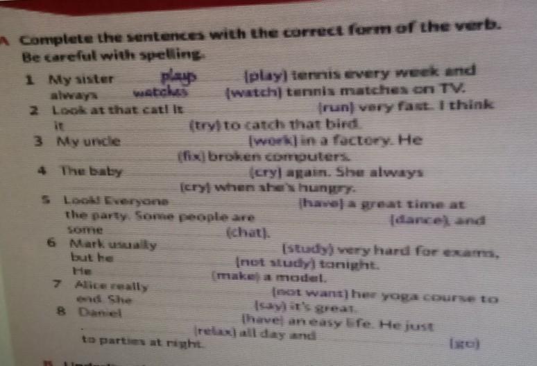 2 is running, is trying 3 works, fixes 4 is crying, cries 5 is having ( веселятся сейчас!) are dancing, are chatting 6 studies, isn't studying tonight 7 doesn't want, says 8 has, relaxes, goes