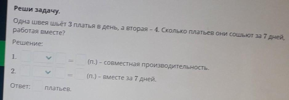Одна швея шьёт 3 платья в день, а вторая – 4. Сколько платьев они сошьют за 7 дней,