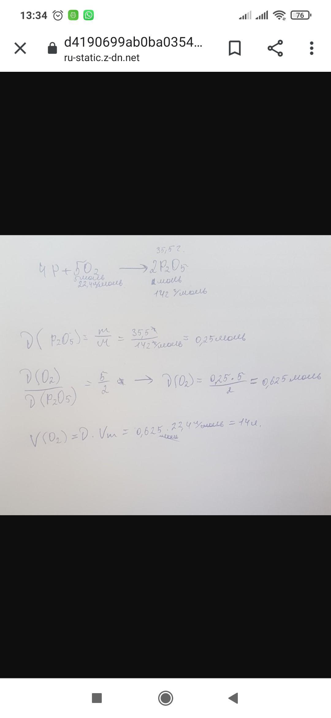 Какой объём кислорода вступил в реакцию с фосфором, если при этом получено 35,5 гоксида фосфора P205?