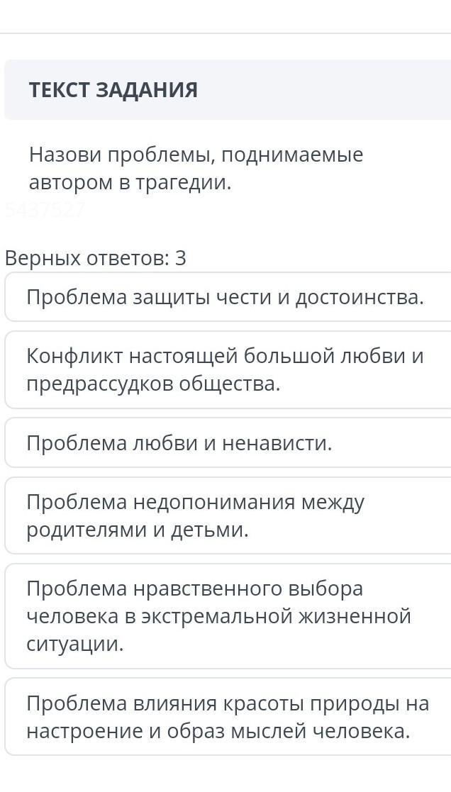 1) Конфликт настоящей большой любви и предрассудков общества. 2) Проблема недопонимания между родителями и детьми. 3) Проблема нравственного выбора человека в экстр. жизненной ситуации.