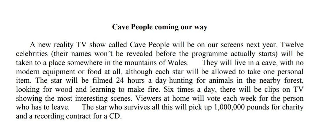 2. Where are they going to live? _______________________________________________ 3. What will each contestant be able to take with them? _______________________________________________