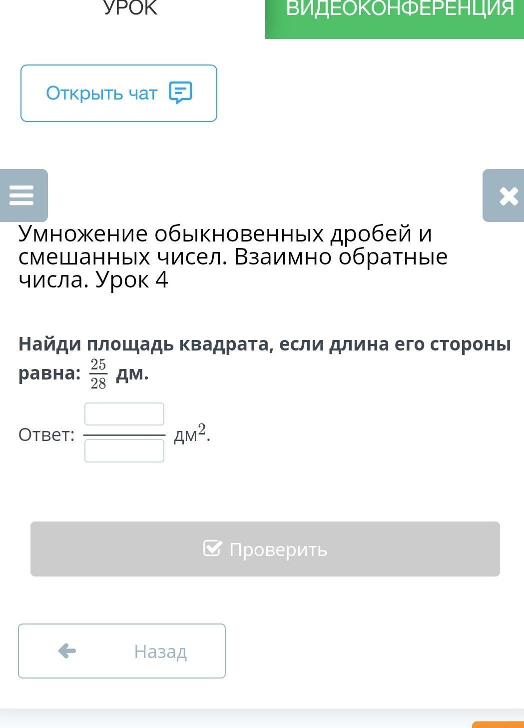 Найди площадь квадрата, если длина его стороны равна:25/28