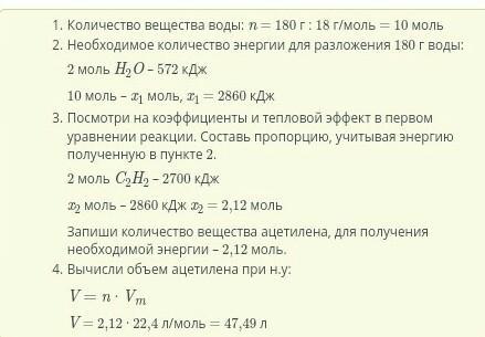 Посмотри на коэффициенты и тепловой эффект в первом уравнении реакции. Составь пропорцию, учитывая энергию полученную в пункте 2. Запиши количество вещества ацетилена, для получения необходимой энергии. моль.