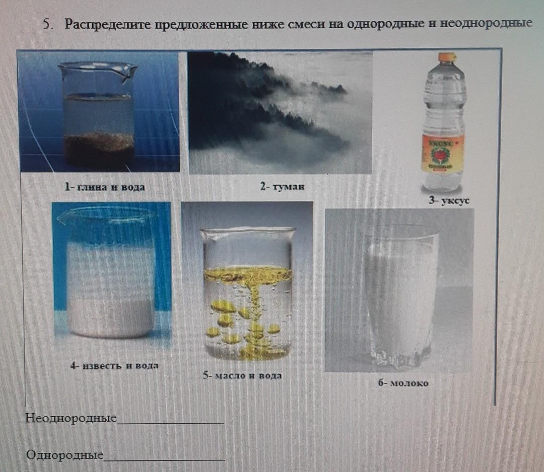 5. Распределите предложенные ниже смеси на однородные и неоднородные