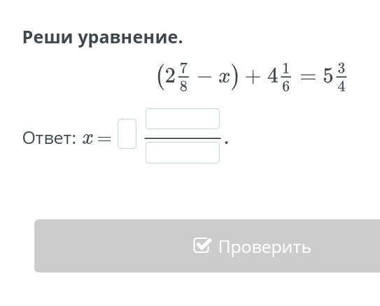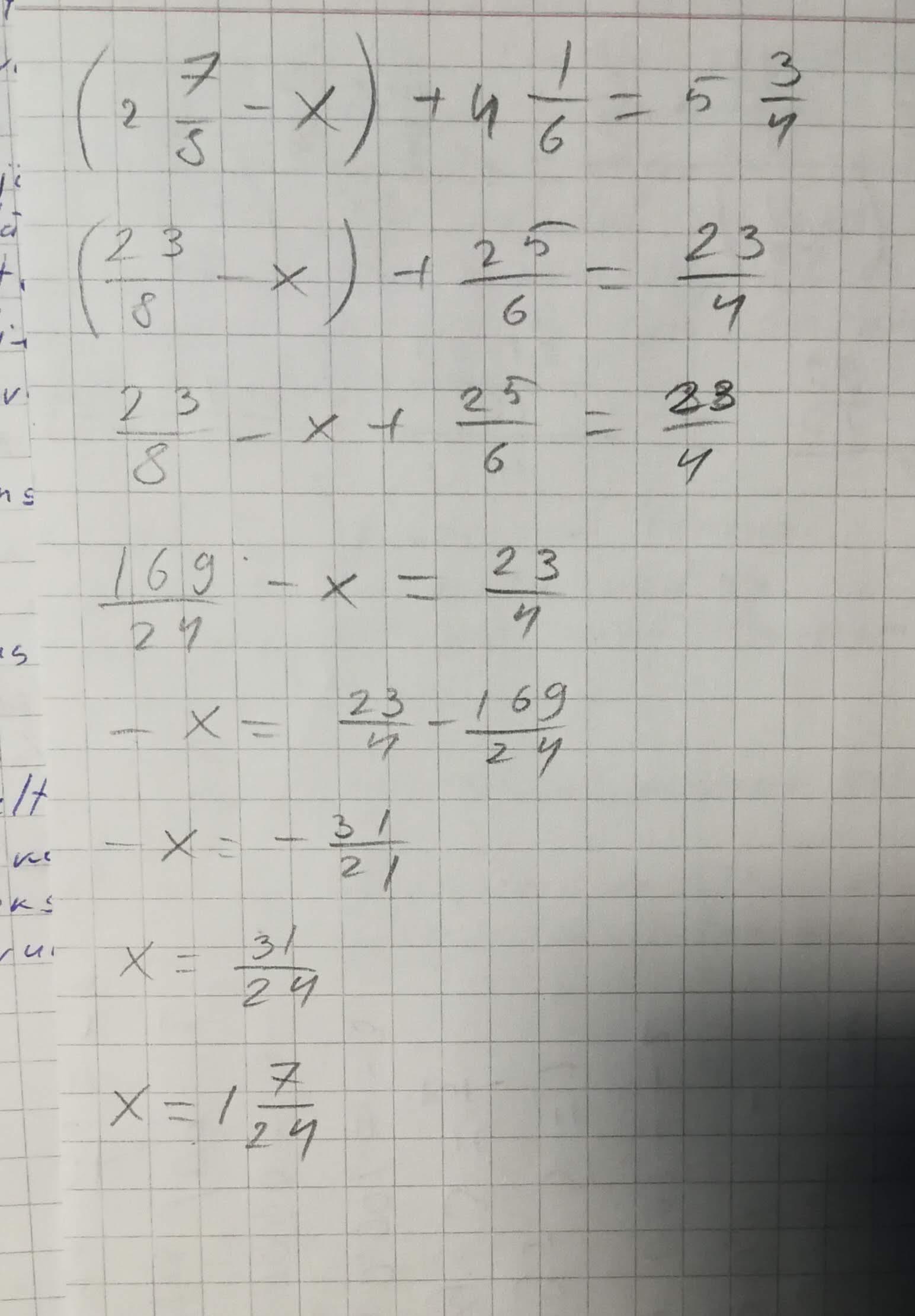 Реши уравнение. (2 7/8 - x) + 4 1/6 = 5 3/4 Ответ: х = Помогитееееееее
